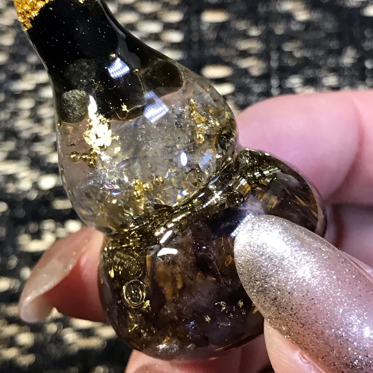 12/2一粒万倍日仕込 12/3山羊座木星期開幕日・一粒万倍日・大安生まれのひょうたん型のオルゴナイトです 一見渋めの印象ですがクォーツ部分の虹とオーラライトの内包物たちに引き込まれます♡ 使用石 ・ゴールデンオディアン ・クラッククォーツ ・オーラライト23 高さ約43mm 最大幅28mm 重さ24.7g
