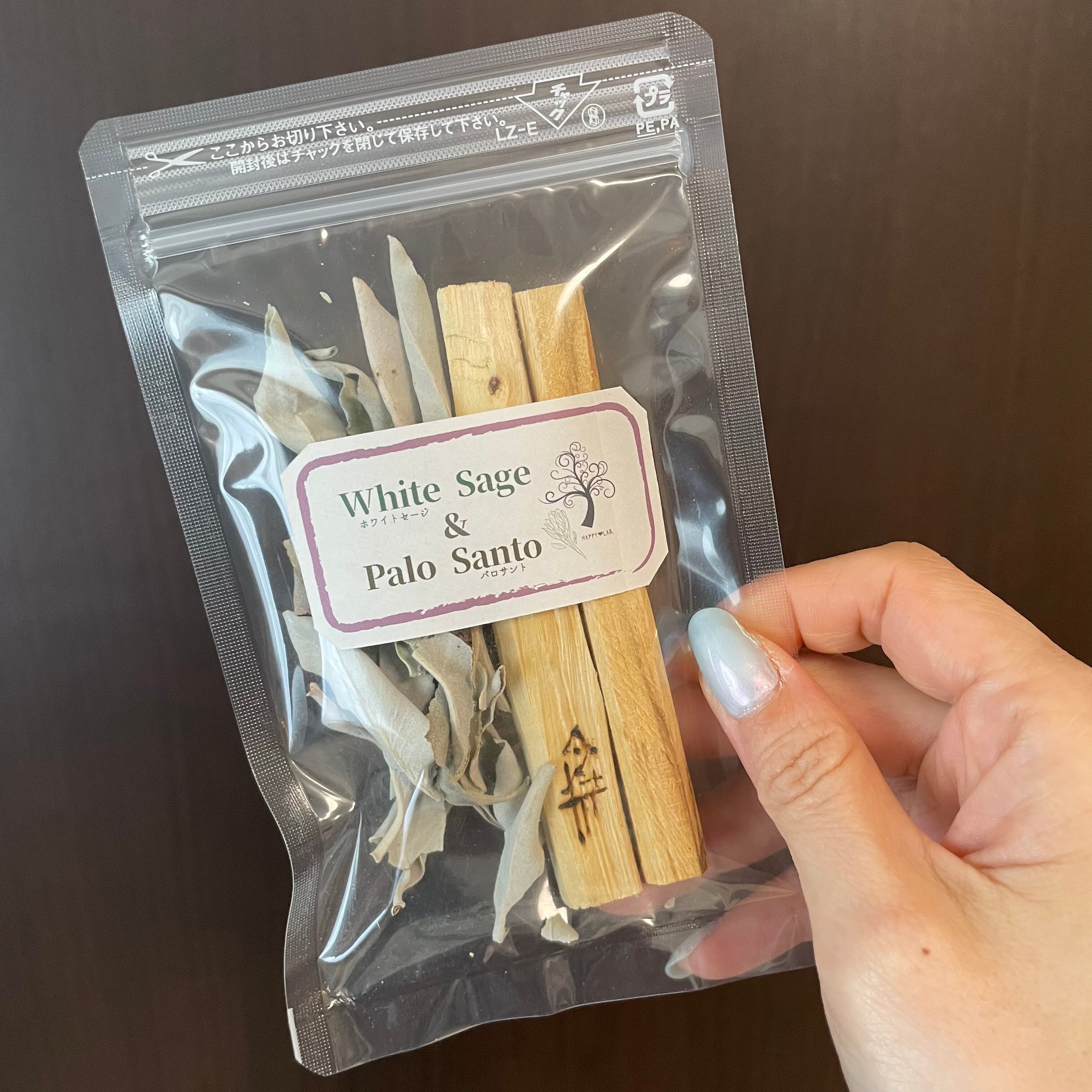 リーフタイプのホワイトセージ約3グラムと約10cmほどのパロサントスティック2本を、ご購入いただいてからパッキングします。