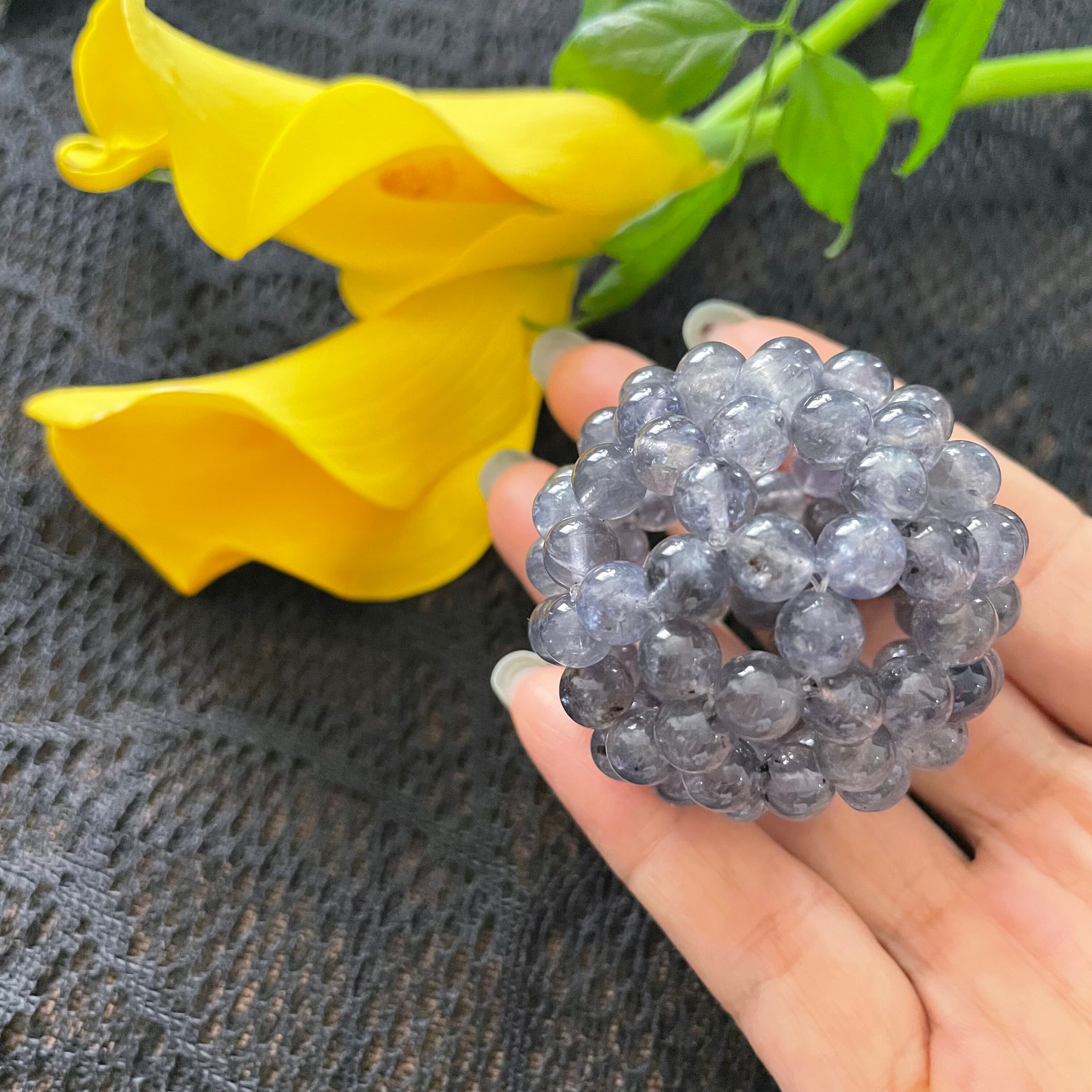 とても不思議なお方でして、ビーズの連の時には紫がかった青に見えて、組み上がったらグレーがかった色合いに、光に透かすと更に表情を変えます。