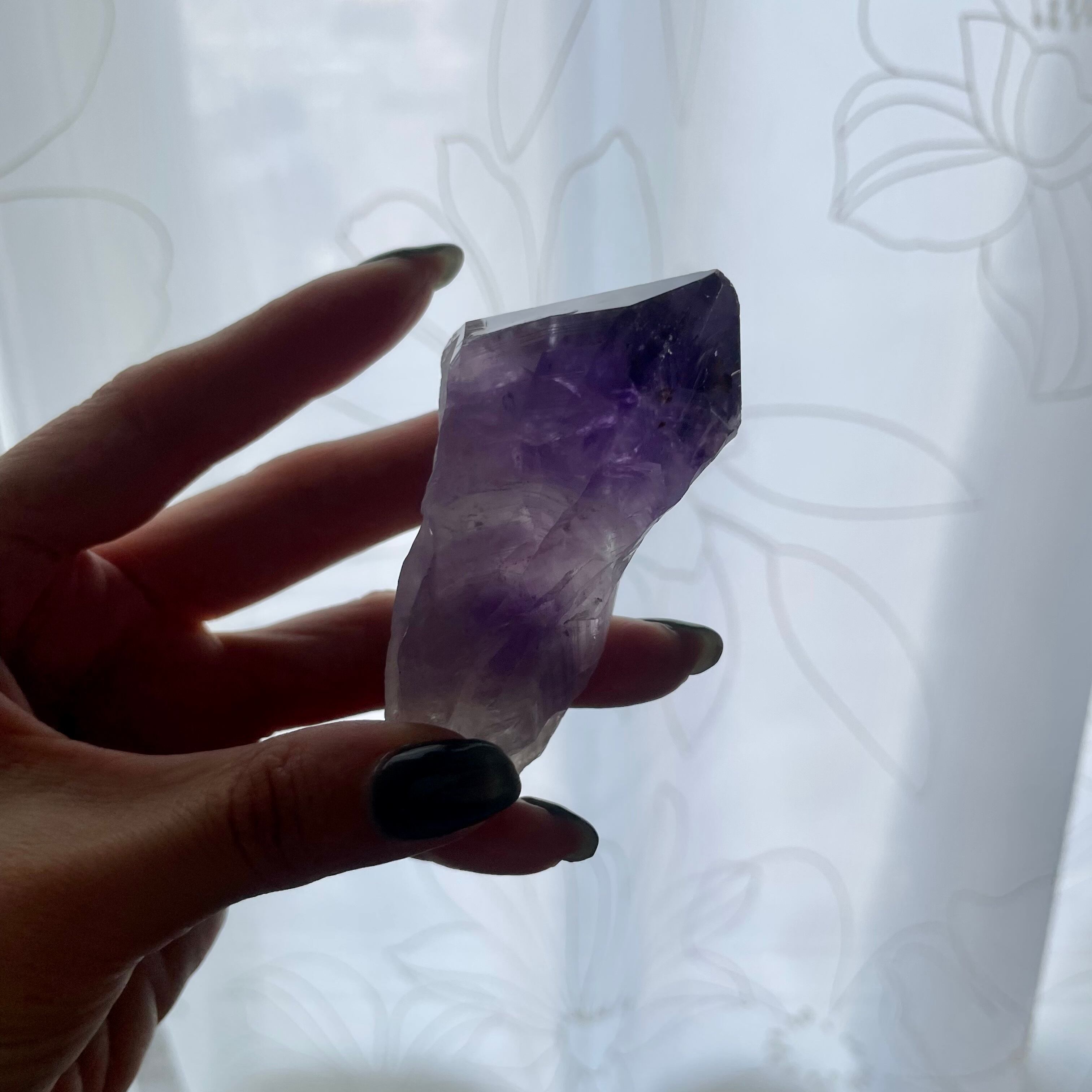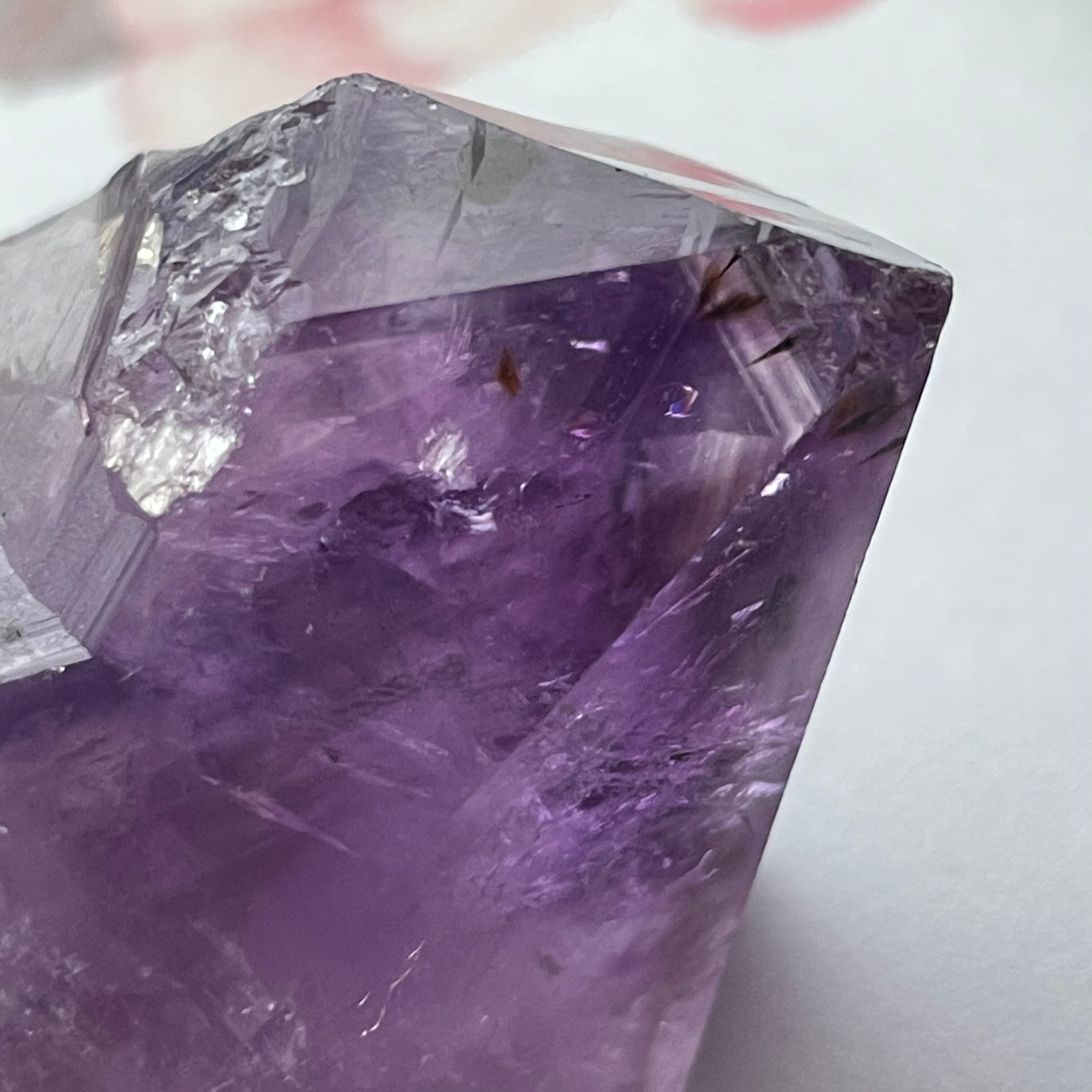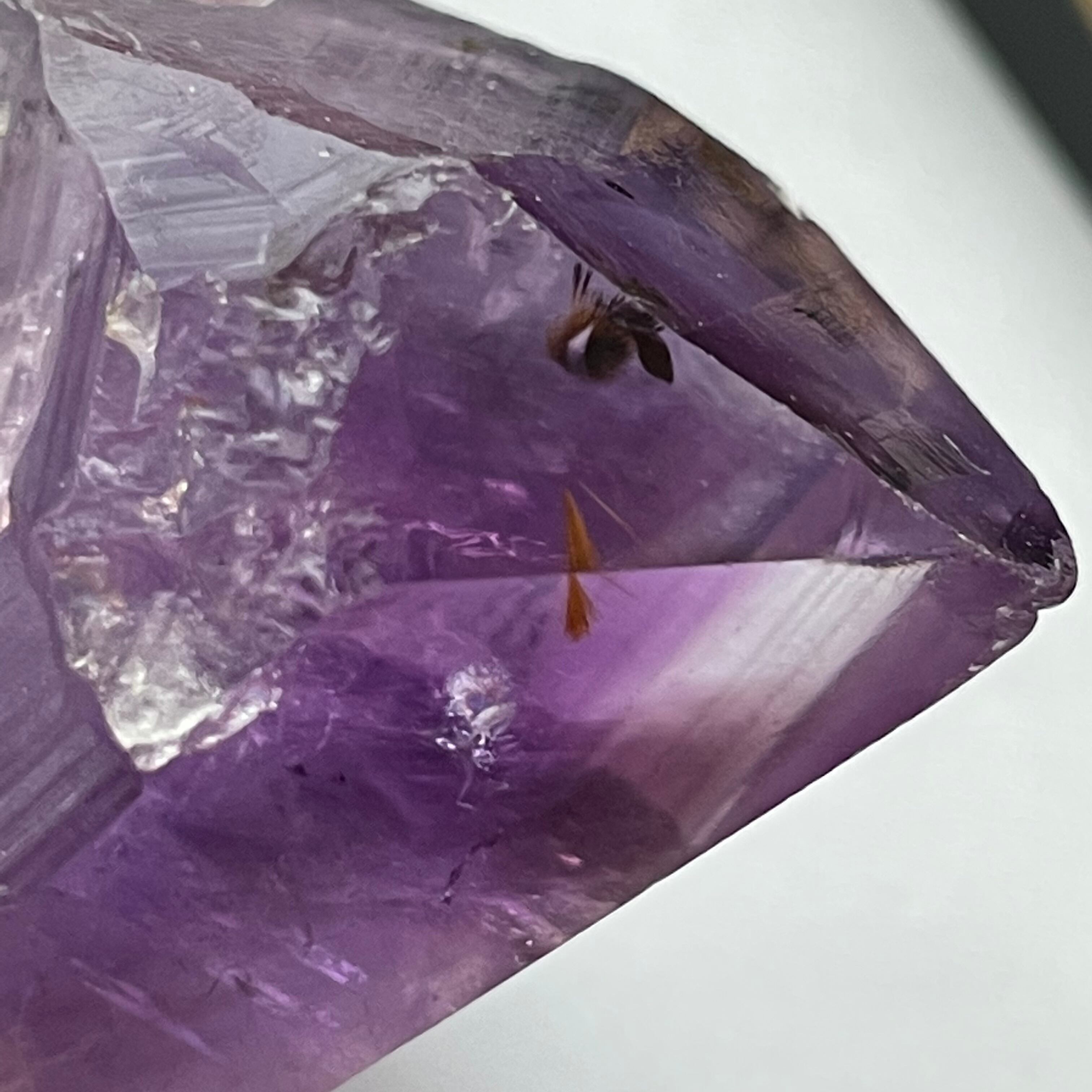 先端にカコクセナイトを内包したアメジストのポイント原石です。