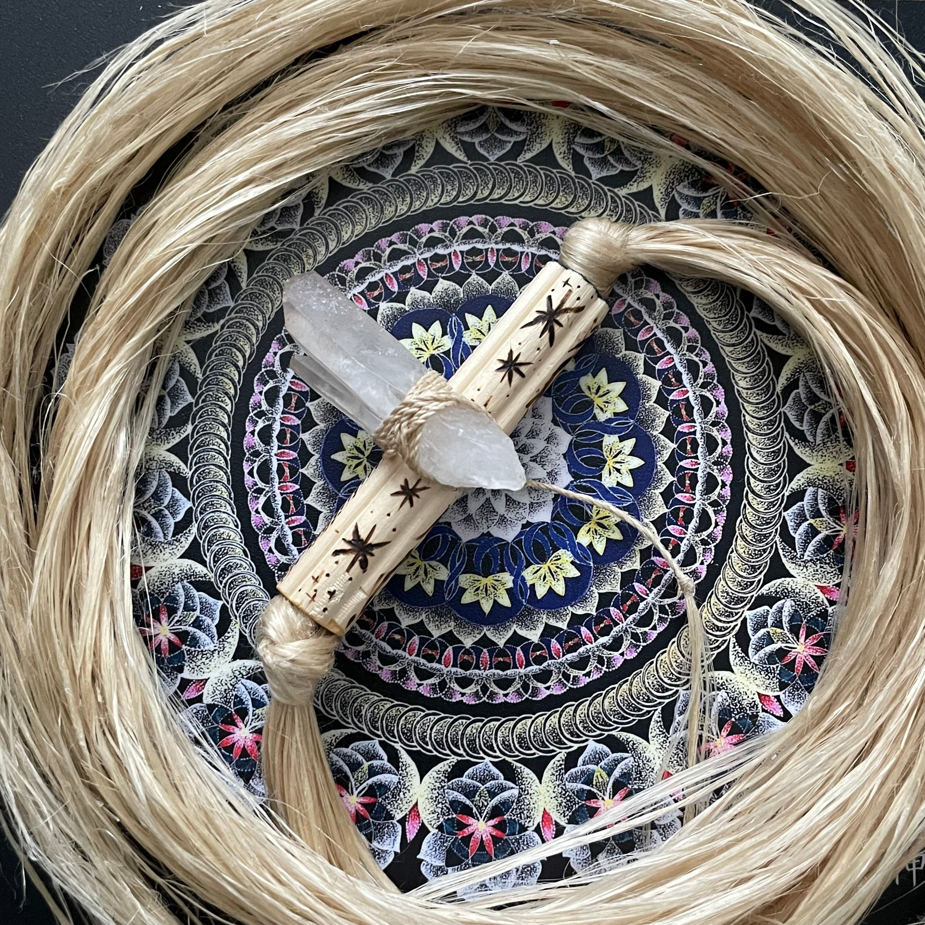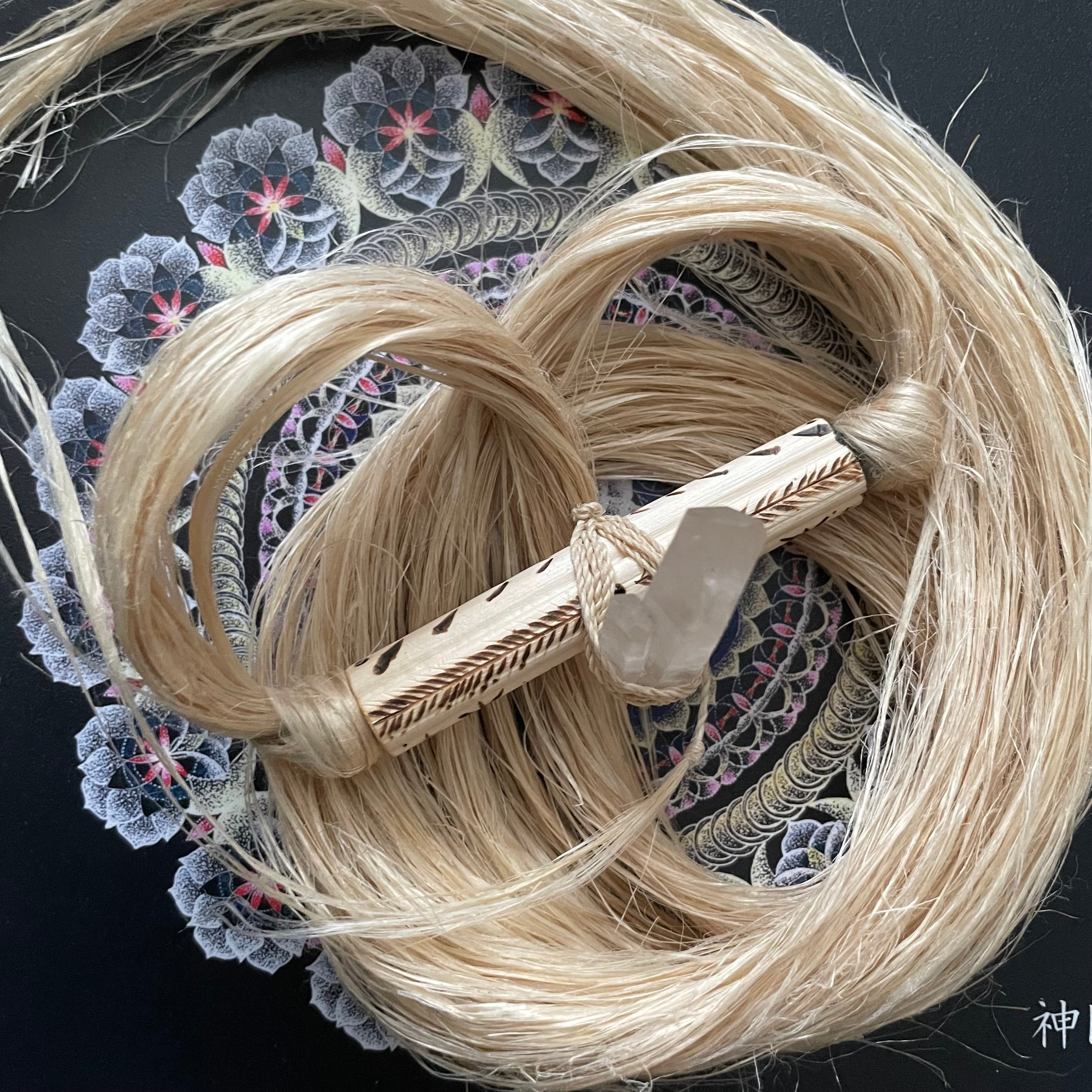 持ち手の麻殻の両極には、シュンガイトとルチルクォーツの絵具で黒と金を入れました✨